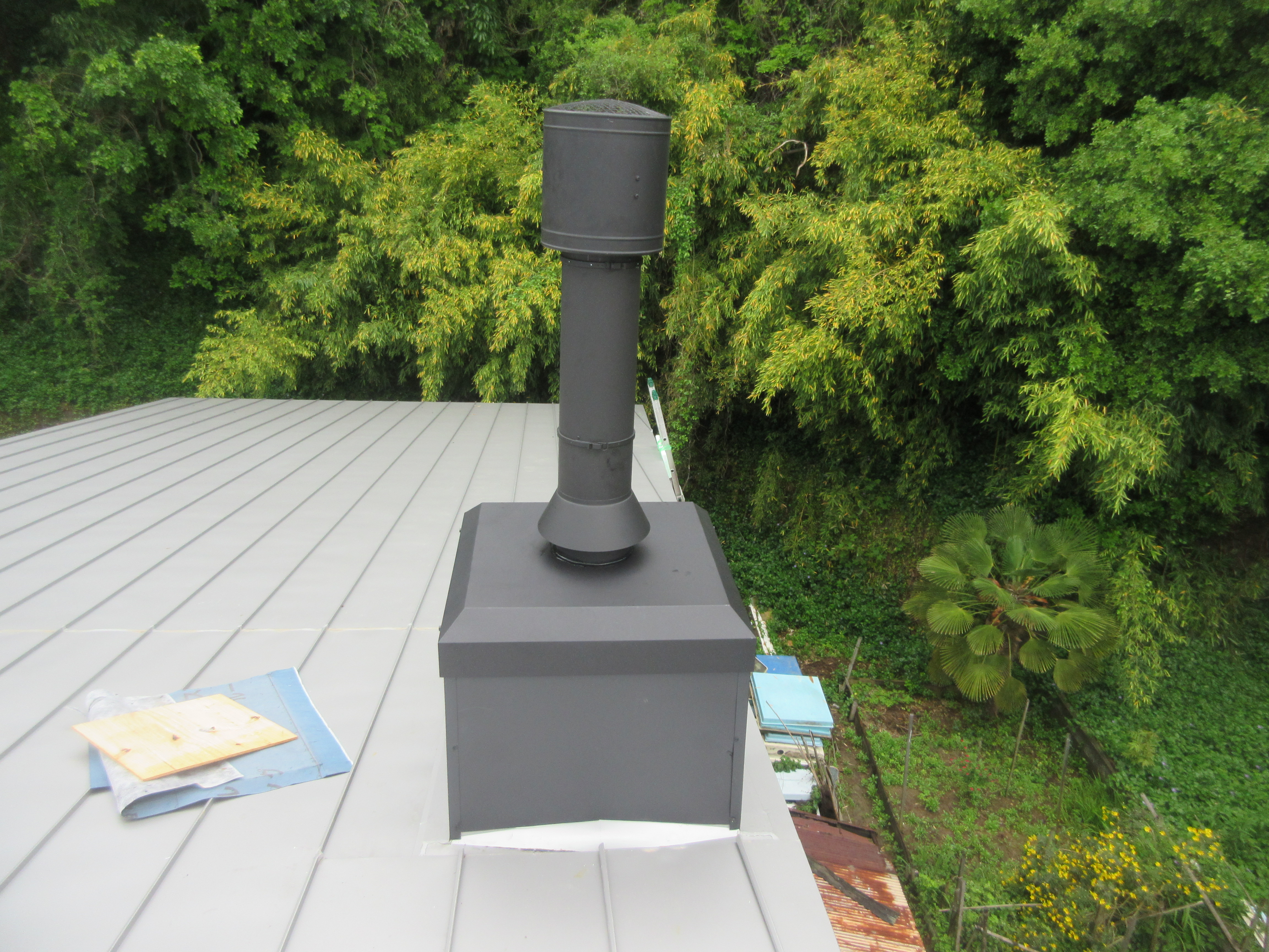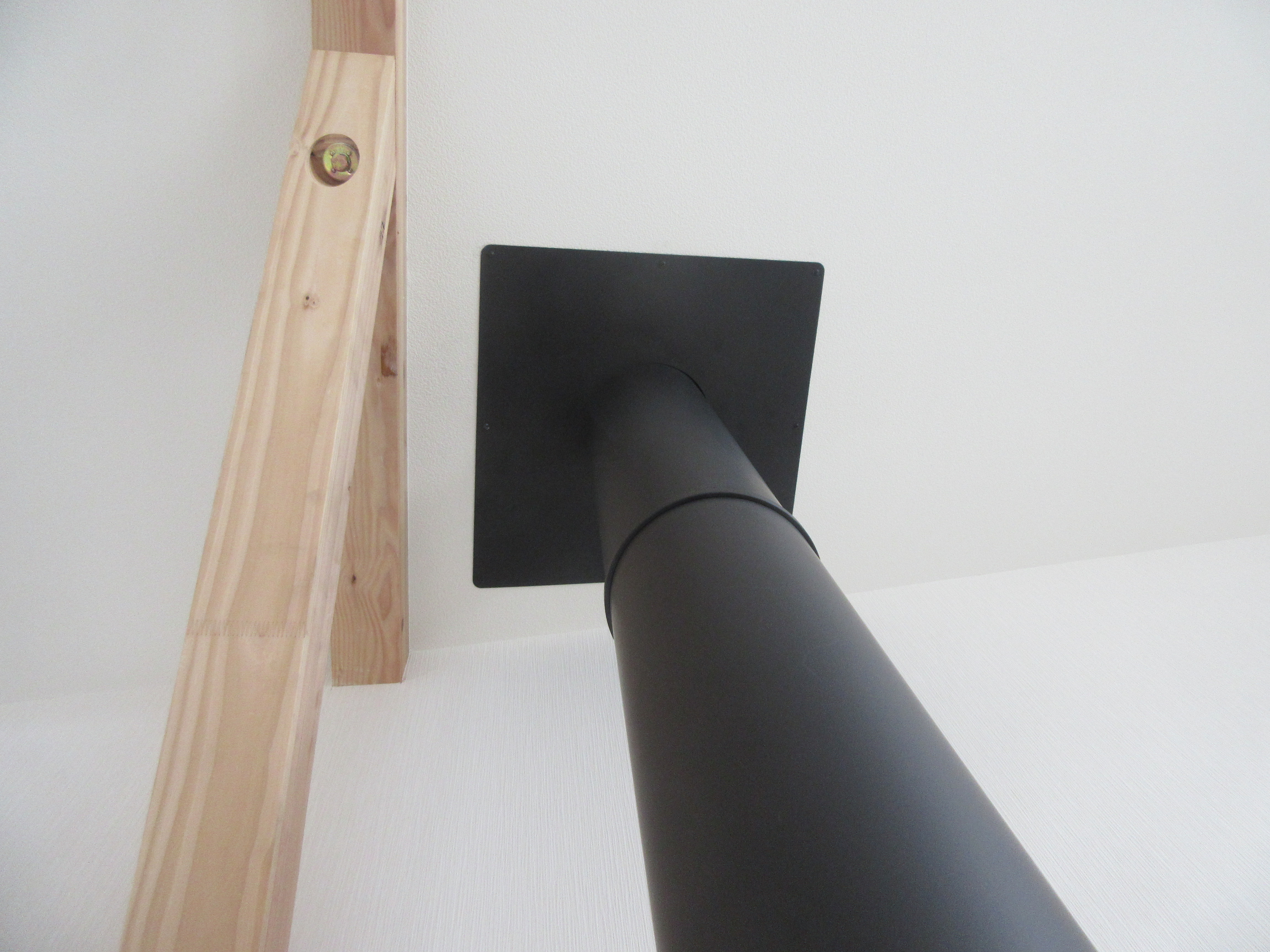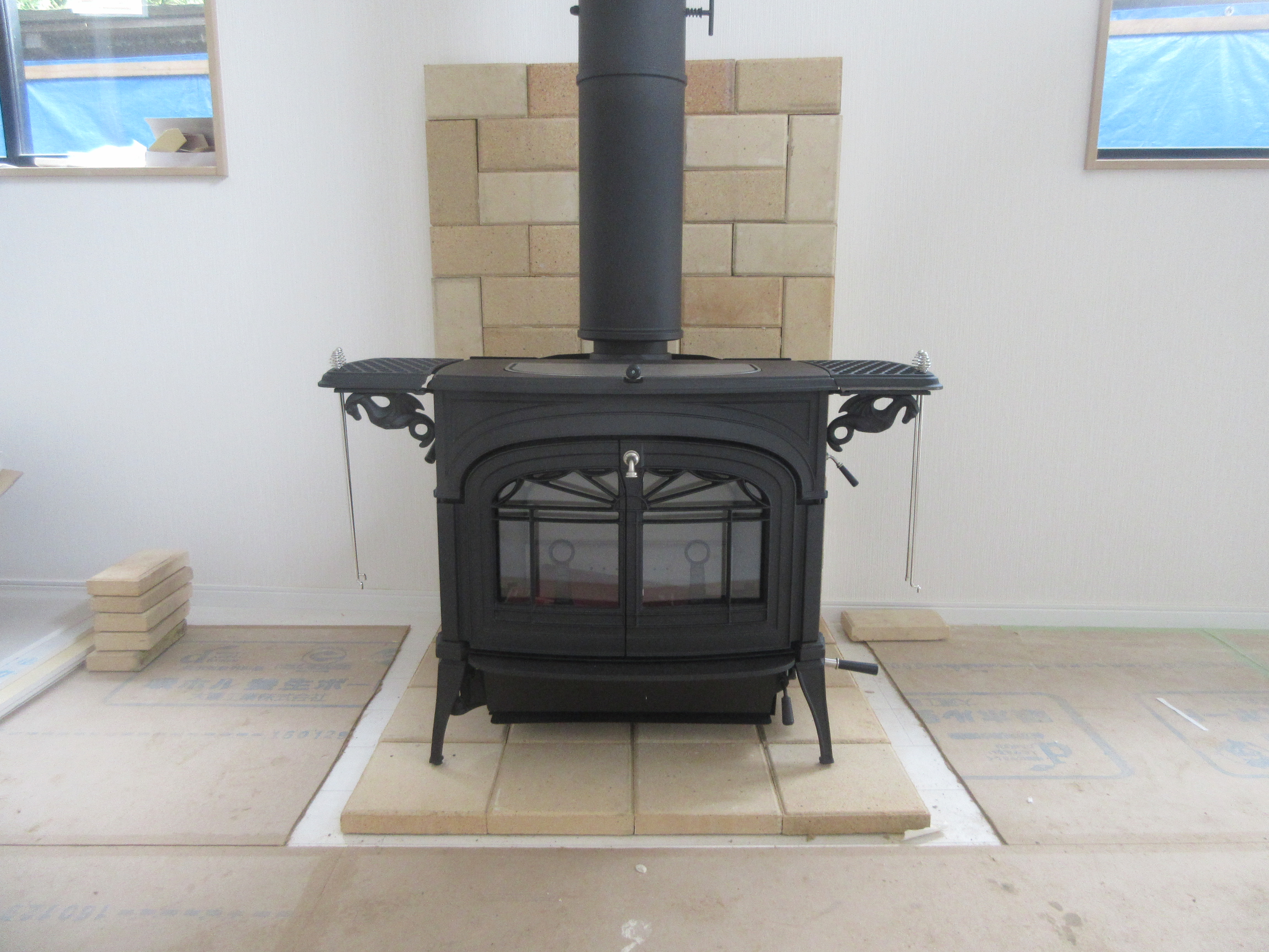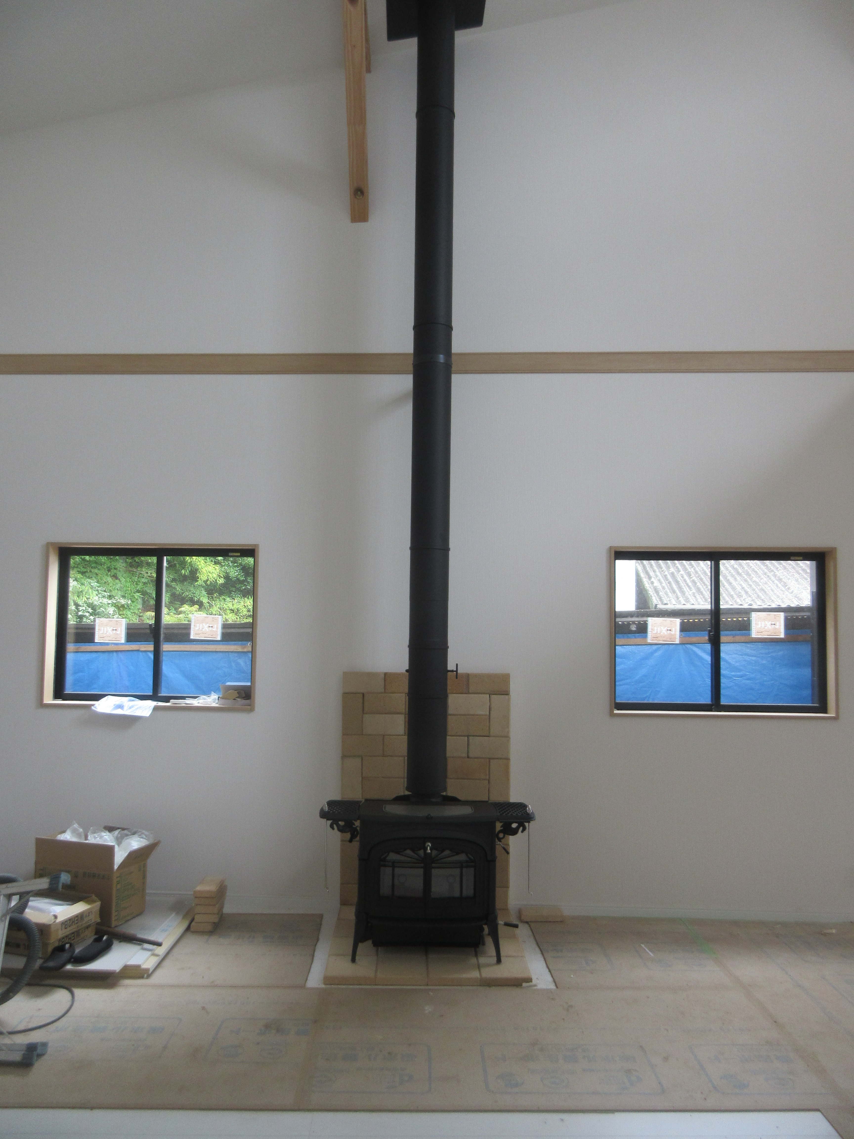 現場レポート 2016/5/27掲載 薪ストーブ設置工事【牛窓町】 先日は牛窓町で薪ストーブ設置工事でした。 リフォーム中の物件に薪ストーブを設置しました。 屋根上にチムニートップの煙突。 支持金具でしっかりと壁と煙突を固定。 屋根勾配に合わせた化粧板を取付ます。 高い吹き抜けの空間を断熱二重煙突がまっすぐ伸びます。 薪ストーブは「バーモントキャスティングス アンコール」 薪ストーブのある素敵な空間になりましたね。 冬がやってくるのが楽しみです♪