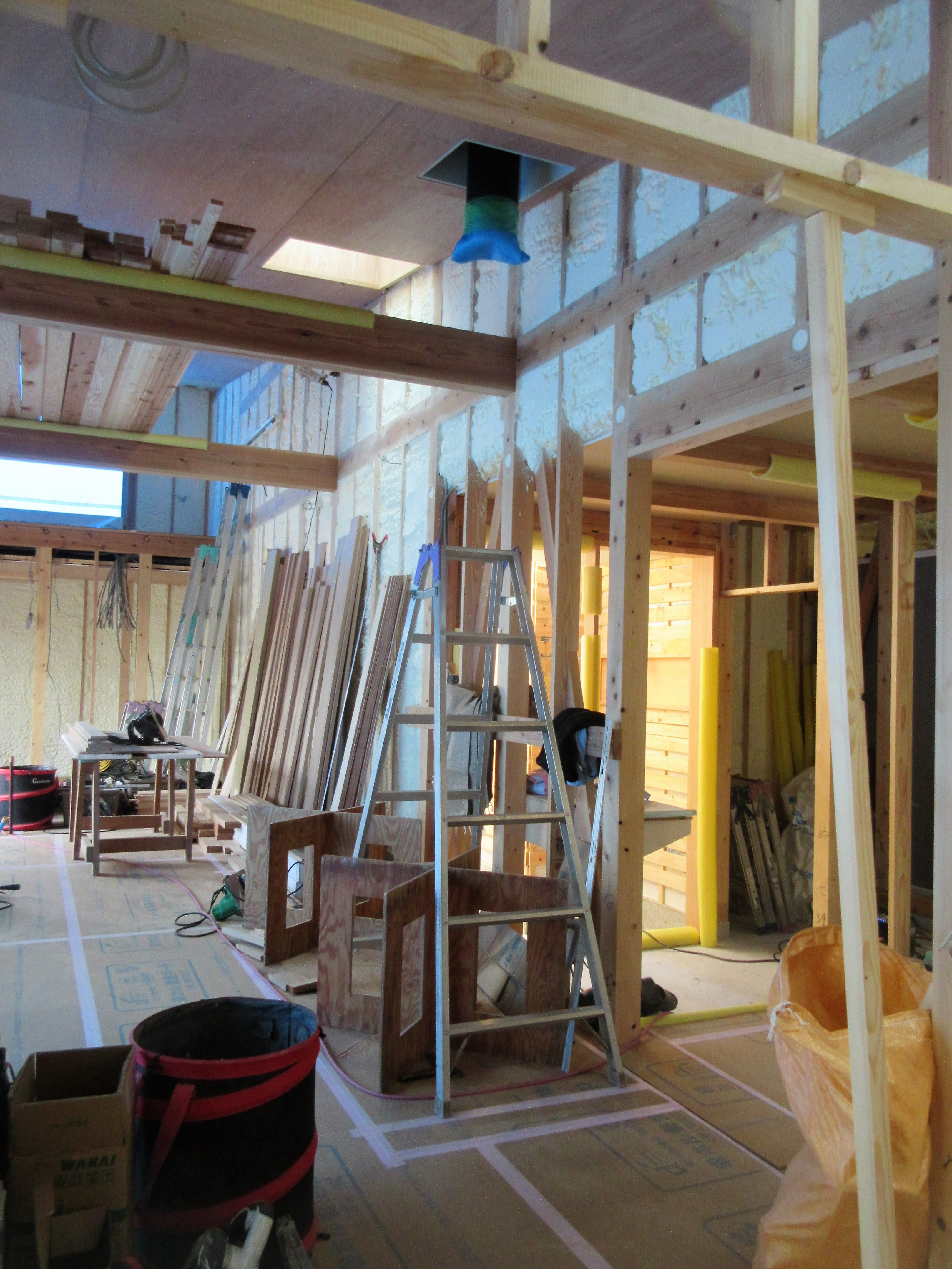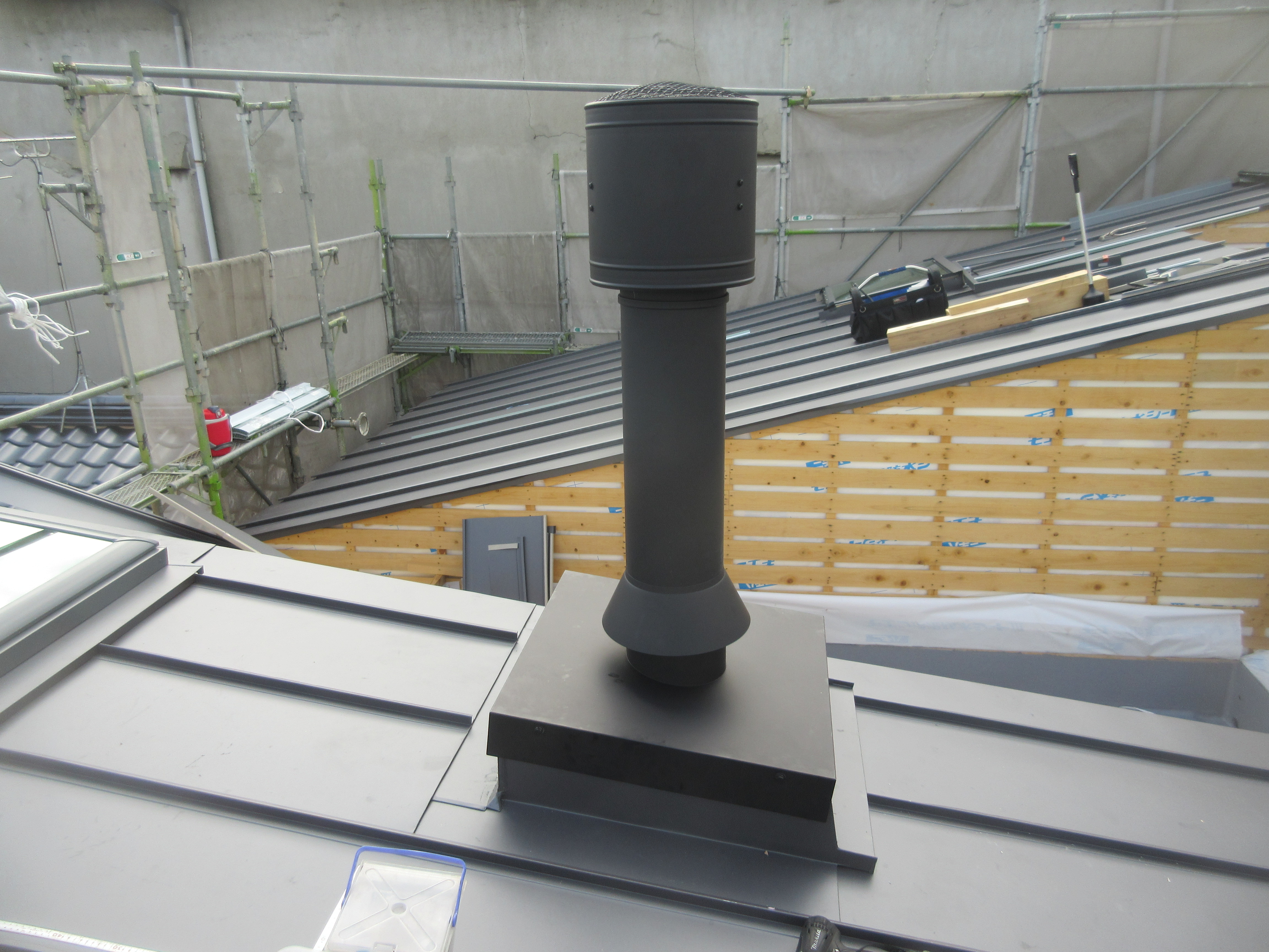 現場レポート 2016/9/5掲載 薪ストーブ設置工事【津山市】 季節は一日一日、秋に近づいているようです。 薪ストーブのシーズン到来までもうすぐですね。 先日は津山市で薪ストーブ設置工事(一期工事)を行いました。 屋根上は特注のチムニーカバーを制作しました。 ガルバ鋼板の屋根にスッキリと納まっています。 室内は貫通部分まで煙突を設置して今回は終了です。 薪ストーブ設置が楽しみですね!