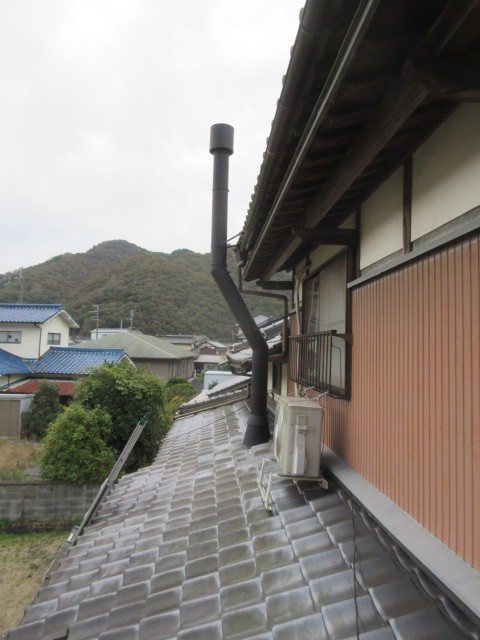 煙突は1階の屋根を貫通して、2階の屋根の軒を交わして上がります。