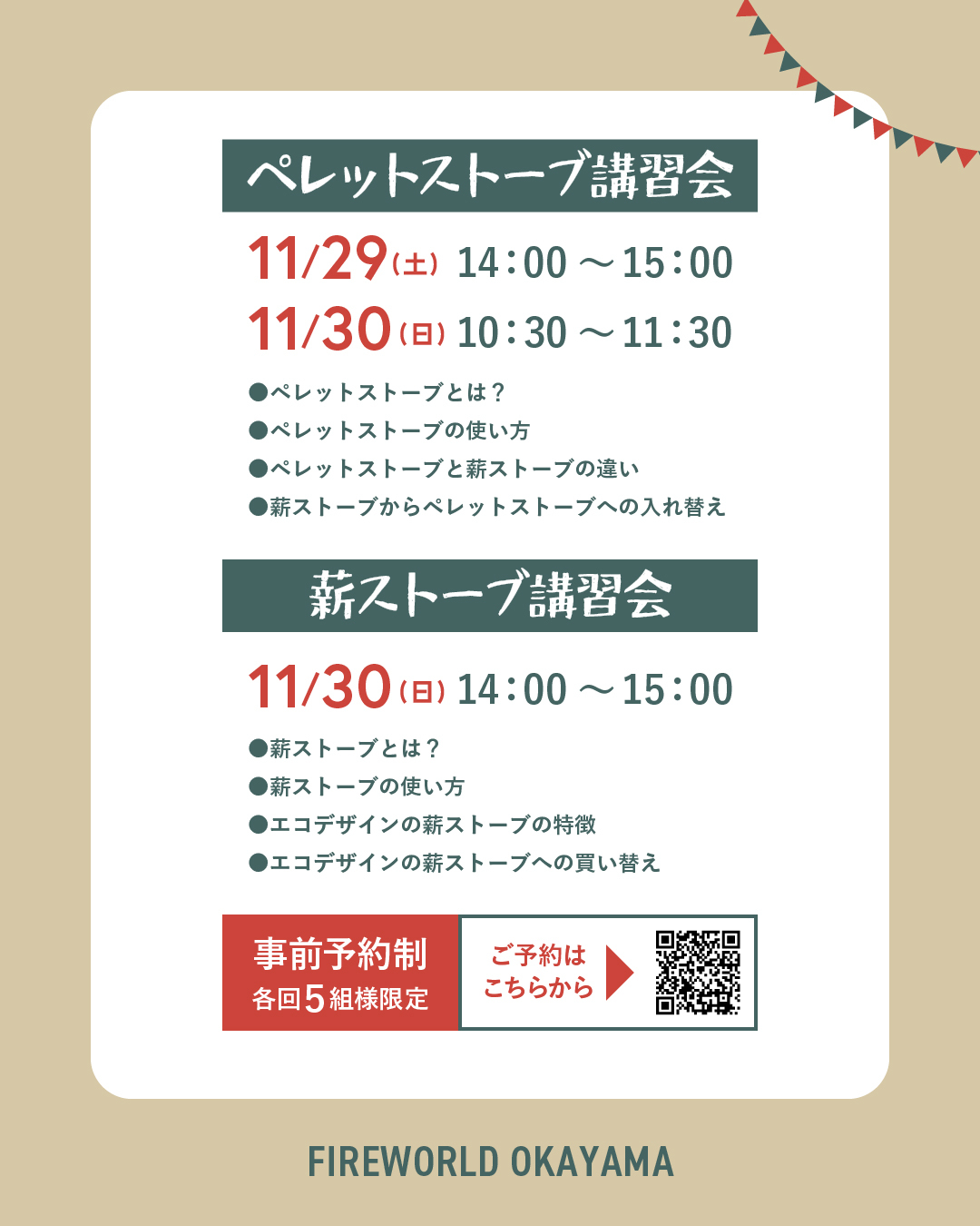 薪ストーブやペレットストーブに興味のある方、お気軽にご相談ください♪講習会は事前予約が必要です💡予約フォームかお電話よりお申し込みください😄