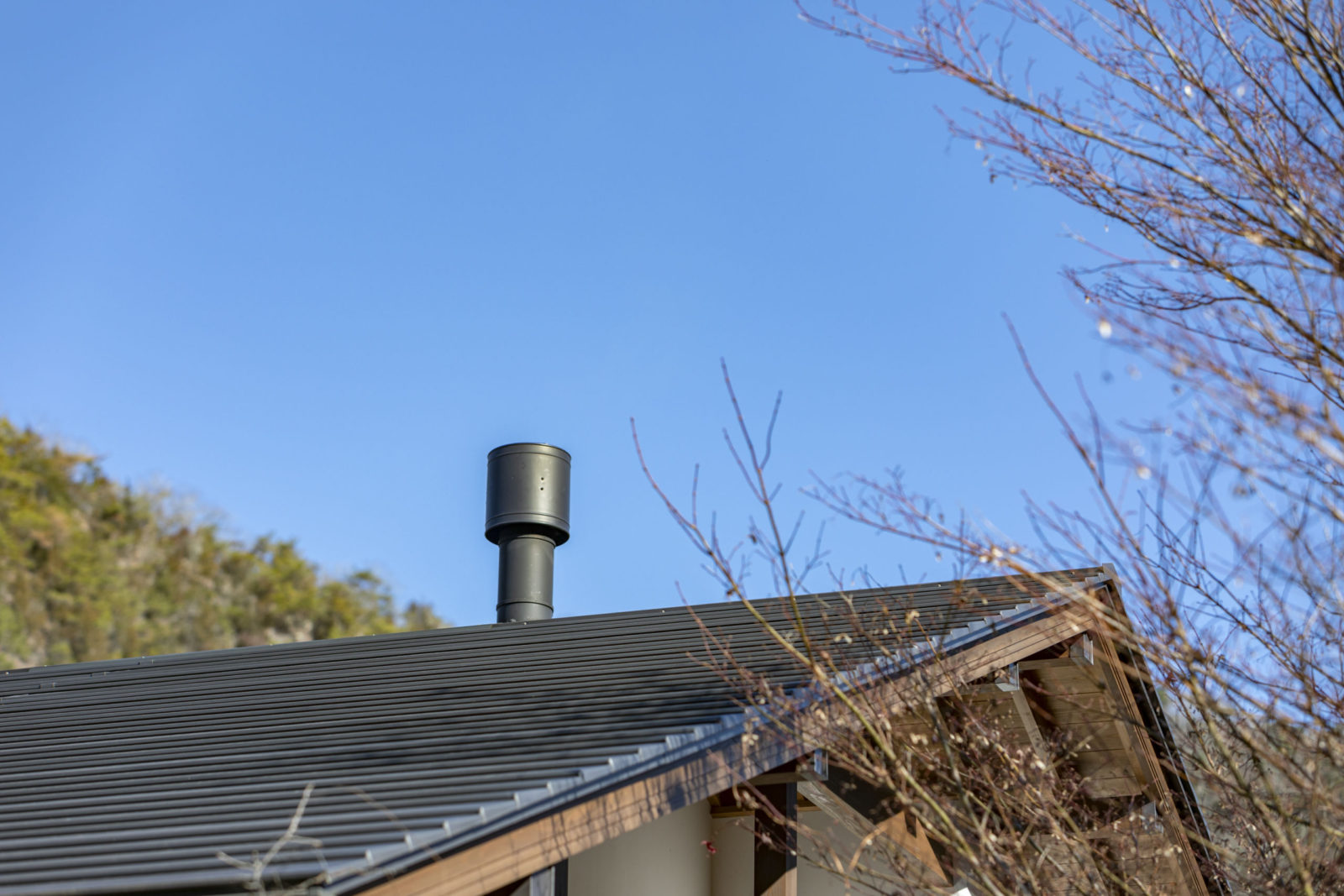 周囲を自然の山に囲まれた立地に佇む平屋の家。