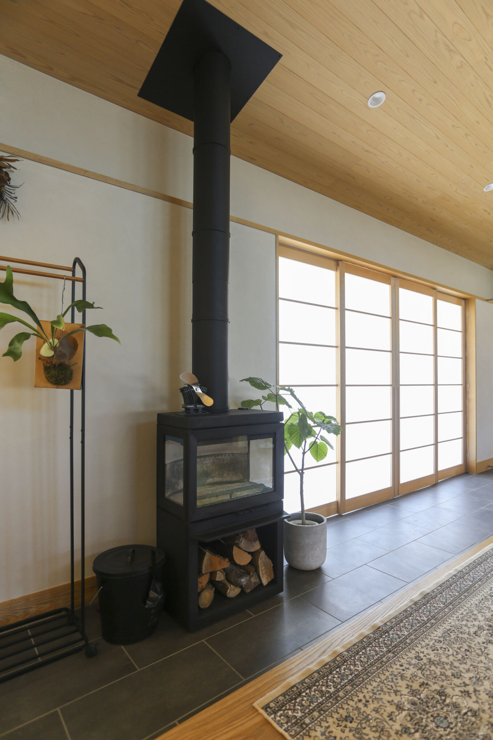 玄関からリビングに続く通り土間に設置した薪ストーブ。